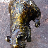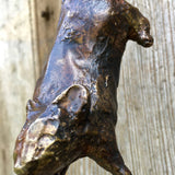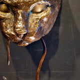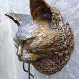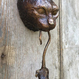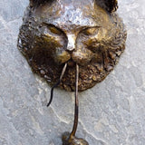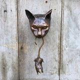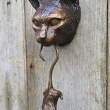 Beautiful original bronze cat portrait of Augie with swinging mouse in his mouth, designed for use as door knocker or wall sculpture.