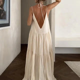 The Elegant Arielle™ Deep V-Neckline Maxi Dress, with its deep V-neckline, strappy details, and flowing silhouette in subtle beige, is your perfect choice for making a stylish statement!